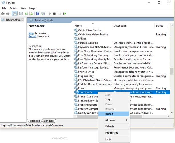 Trong cửa sổ mới hiện lên, cuộn xuống cho tới khi bạn nhìn thấy mục Printer Spooler , click chuột phải vào nó và nhấn vào Restart .