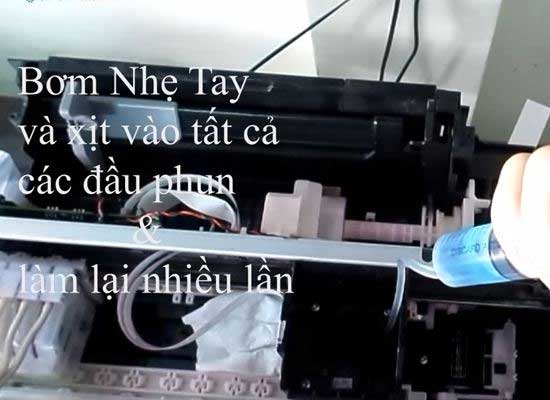 - Cho cồn 90 độ và xi lanh và dùng xi lanh truyền trực tiếp cồn qua ống mực để làm sạch đầu phun.