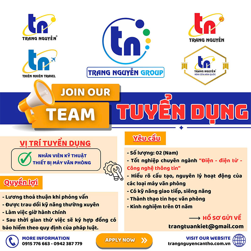 Nhằm mở rộng quy mô và phát triển các lĩnh vực hoạt động, Trang Nguyễn Group – đơn vị đa ngành trong thiết bị máy văn phòng, du lịch lữ hành, phòng cháy chữa cháy và rèm cửa Hàn Quốc – hiện đang tìm kiếm Nhân viên Kỹ thuật năng động, nhiệt huyết gia nhập đội ngũ.